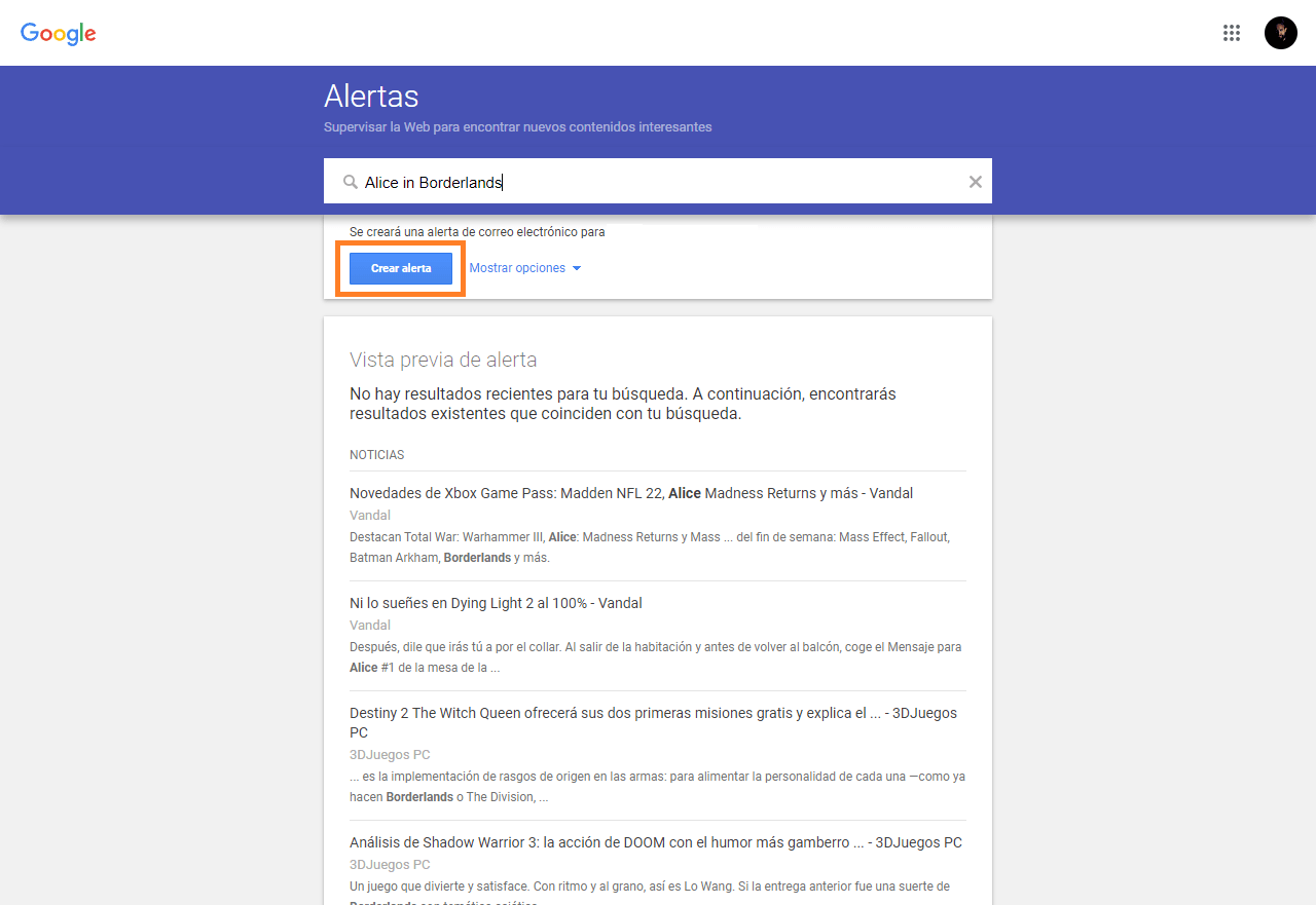 Cuando estés configurando los parámetros de la alerta, Google te mostrará una previsualización con el ejemplo de las páginas sobre las que te avisará.