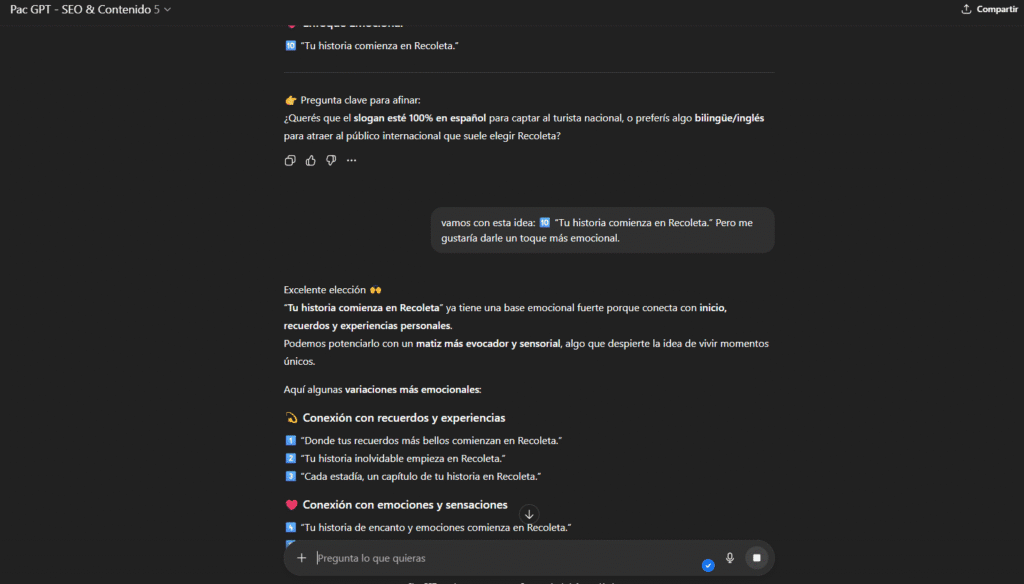 Si querés aprovechar la inteligencia artificial para crear tu eslogan hotelero, PacGPT tiene una herramienta llamada Brainstormentor. Te permite generar ideas creativas, variaciones y refinamientos rápidos.