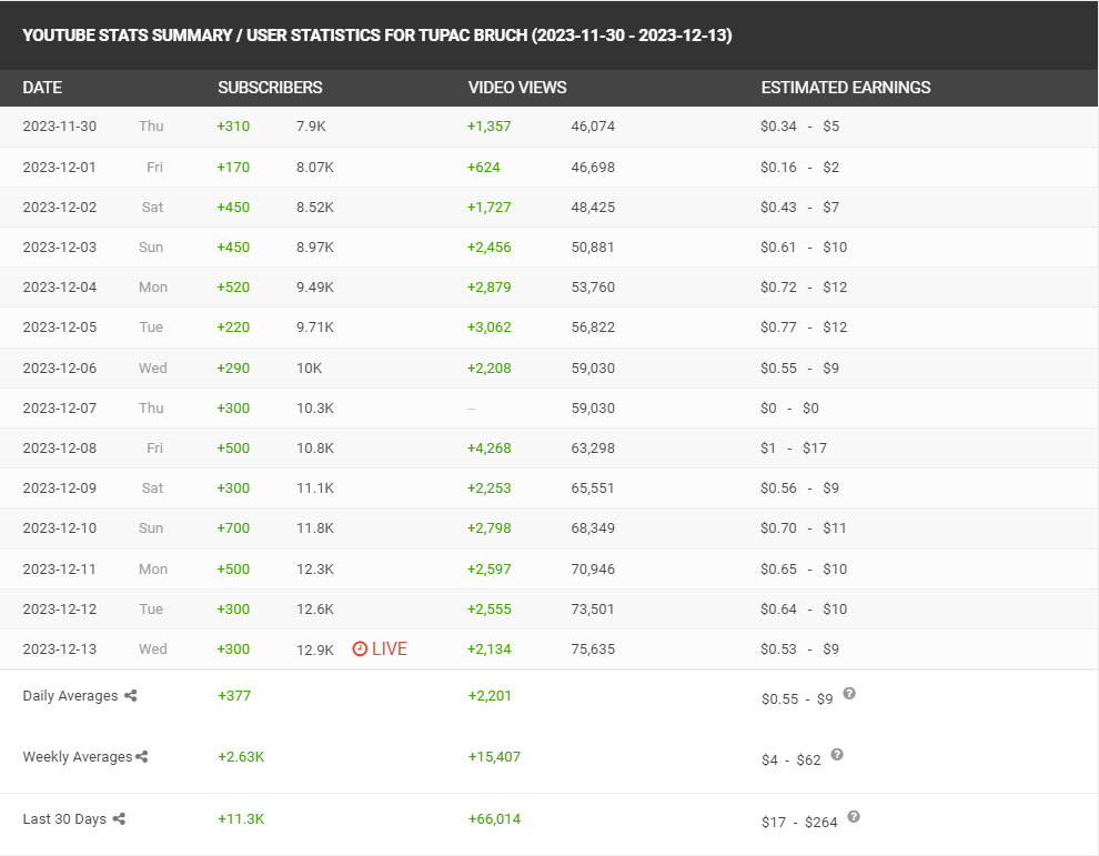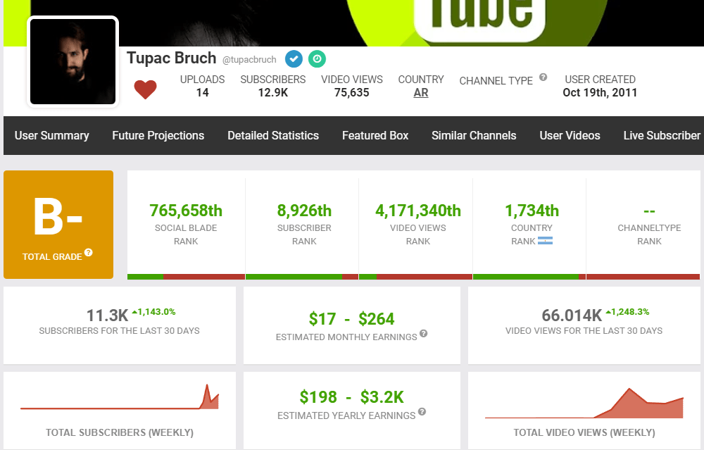 Para cerrar, les muestro metricas de SocialBlade de mi propio canal (pasé de 10 subs a 12k en tan sólo un mes):