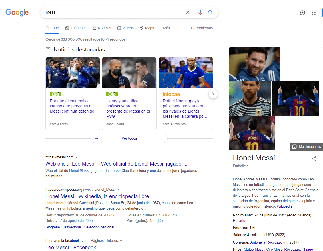 Por ejemplo si buscas Messi, los resultados que te mostrará Google, serán todos relacionados con: «el mejor futbolista en la actualidad y de todos los tiempos».