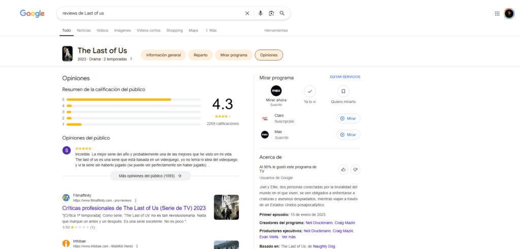 Luego, como te habrás dado cuenta, cada vez que buscas un artista, un grupo musical, una película o un monumento, en la zona derecha del buscador sale información sobre él. A esto se le conoce como Knowledge Graph, y también son formatos enriquecidos.