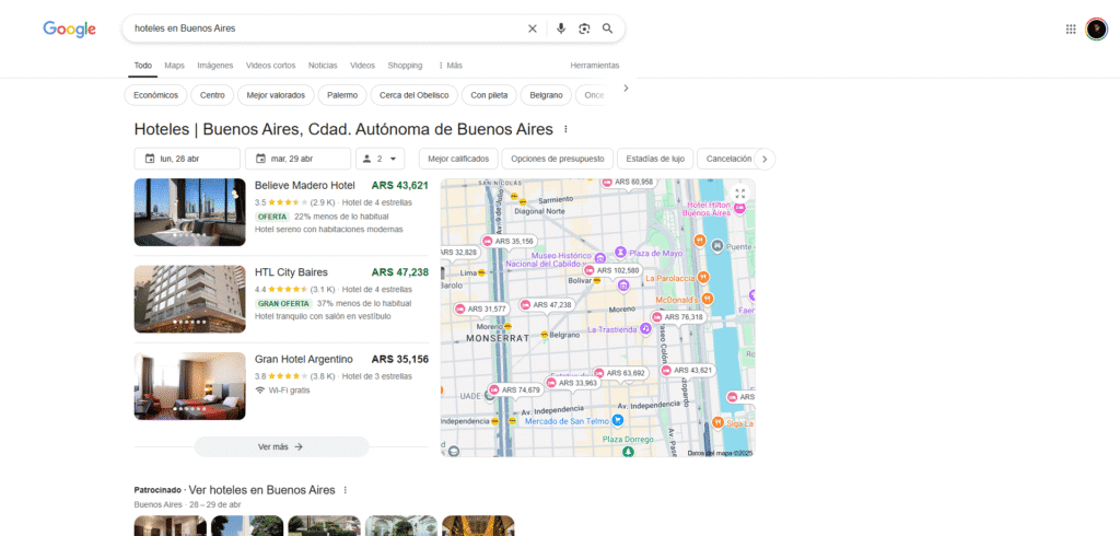 Por ejemplo, si buscamos la palabra clave «hoteles en Buenos Aires» en Google, aparecerán, dentro de los resultados orgánicos, títulos, información y la URL de algunos alojamientos en esta ciudad, además de estrellas que indican la valoración de los usuarios y términos relacionados a la búsqueda como ofertas, traslados, entre otros.