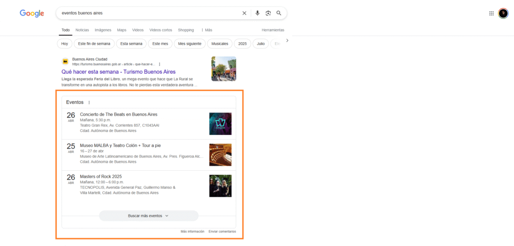 Para conseguir un Rich Snippet en esta clase de búsqueda. Entonces, es importante luchar para aparecer como primer resultado orgánico y poder ofrecer el servicio de reservas y venta de entradas para una función.