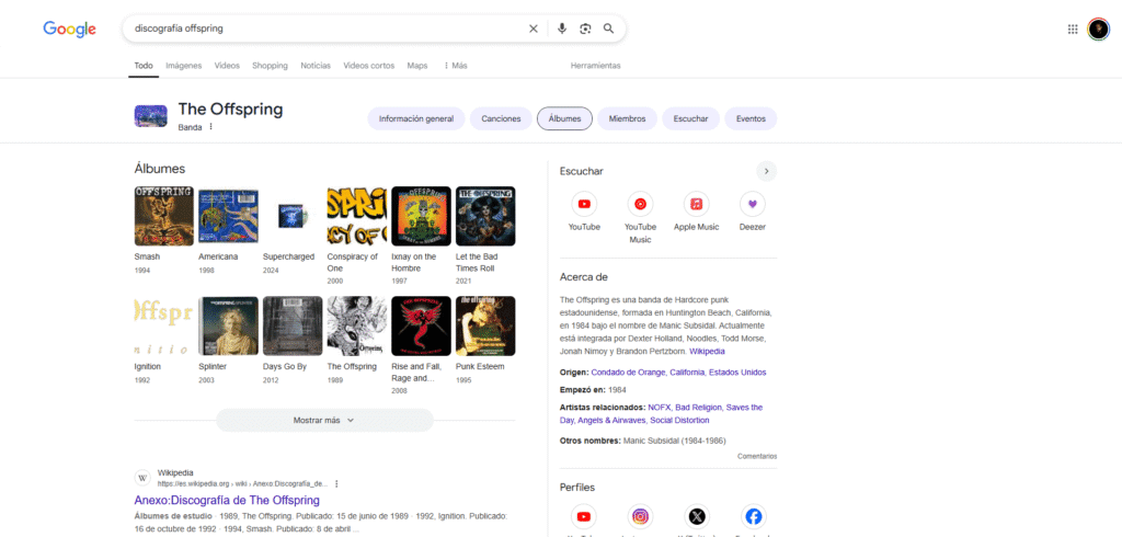 Al buscar sobre una banda, artista, álbum o canción en Google, aparecerá una caja con una breve información sobre el artista, miembros y géneros a los que pertenecen, seguido de servicios de streaming donde sus productos puedan ser escuchados o comprados por los internautas.