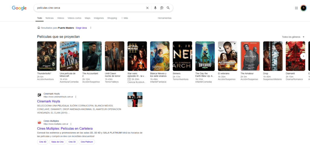 En este caso, los buscadores tienden a informar más sobre el propio proyecto, como información de las cintas, reparto, rating, fecha de estreno, entre otros, en vez de centrarse en sitios para reservar boletos.