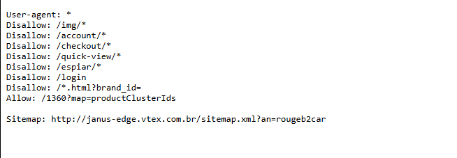 - Robots.txt: El robots tiene un problema técnico de cómo está creado, y además redirecciona a un sitemap de otro sitio en vtex que nada que ver. Miren el Robots de Rouge: https://www.perfumeriasrouge.com/robots.txt